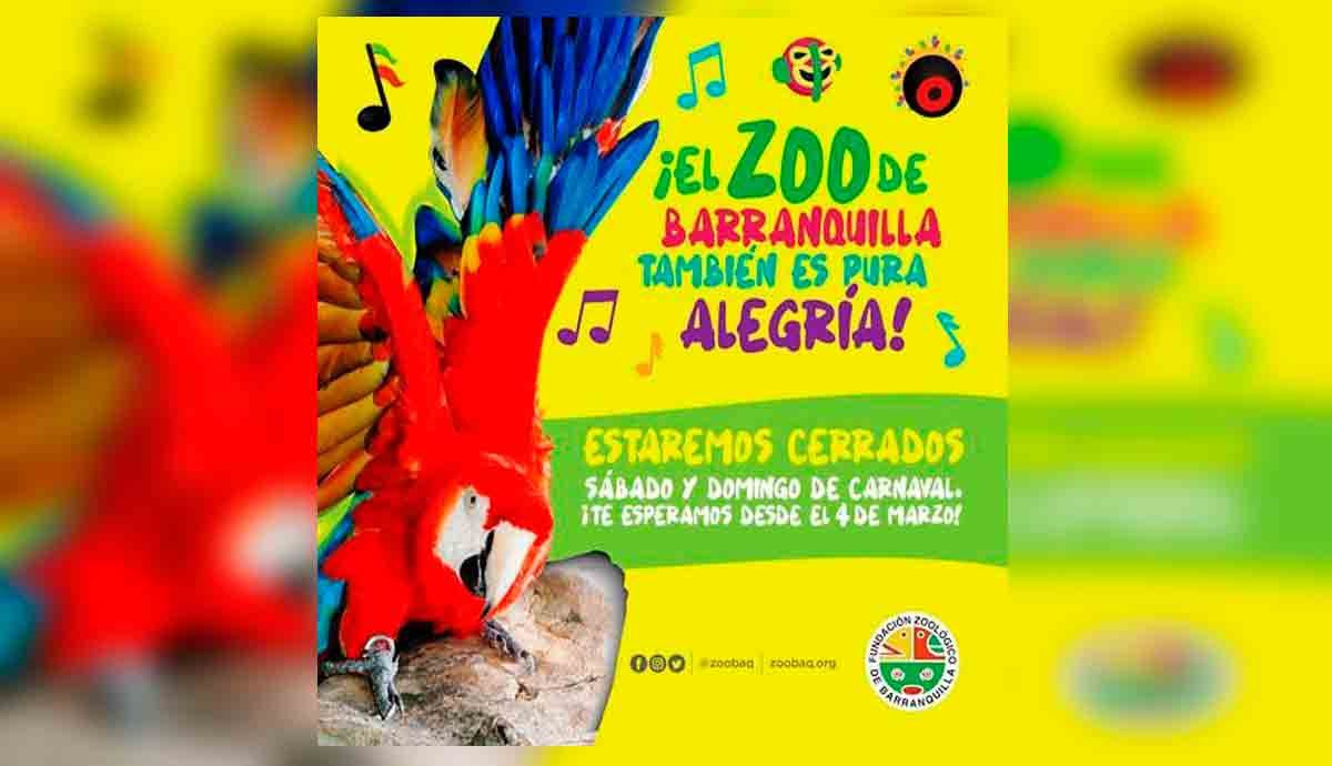 Debido a la celebración de los Carnavales y los eventos que se llevan a cabo en cercanías al Zoológico de Barranquilla, éste no tendrá atención al público los días 2 y 3 de marzo (sábado y domingo de Carnaval, respectivamente). El horario se restablecerá a partir del lunes, 4 de marzo, en jornada continua de 9:00 a. m. a 5:00 p. m.Además de los 600 animales de 130 especies de Colombia y el mundo cuidados por el centro de conservación, el Zoológico cuenta con un Aviario de Exóticos en el que sus visitantes pueden alimentar a cotorras venezolanas y pericos y cacatúas australianas; así como entrar en contacto con animales domésticos en La Finca; disfrutar una presentación con animales entrenados en el Museo Vivo o aprender más de las habilidades naturales de los animales, a través de las actividades ‘Descubre tu Zoo’ que se llevan a cabo en los hábitats de diversas especies.