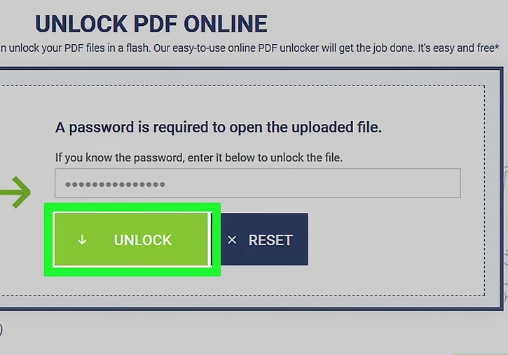 6 Haz clic en DESBLOQUEAR. Es un botón verde ubicado debajo del cuadro de texto. Soda PDF ahora eliminará el cifrado del archivo PDF.