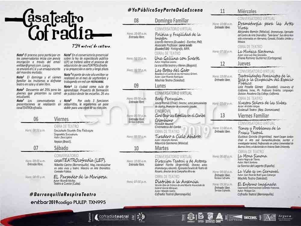 En el mes del amor y la amistad, llega el Festival Internacional de teatro Enitbar, el mejor regalo que le puedes dar al teatro en el mes del amor y la amistad es asistiendo a su fiesta. Bienvenidos a Barranquilla Respira Teatro. Una cartelera con la programación completa de los invitados nacionales e internacionales en Casa Teatro Cofradia.