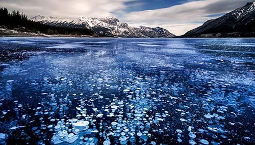 El Lago Baikal  en Rusia, declarado patrimonio de la humanidad por la Unesco,  es el más grande y profundo del mundo contiene el 20% de agua dulce del planeta además es un inmenso depósito de Metano un gas de infecto invernadero, que si se libera podría provocar el aumento de la temperatura media de todo el planeta, afortunada mente la cantidad de metano que llega a la superficie no es considera dañina desde el punto de vista climatológico, sin embargo cuando las temperaturas descienden en invierno y el lago se congela se pude observan las burbujas congeladas que estaban a punto de emerger, creando una pista de patinaje llamando la atención de turista cada año.