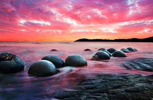 Son rocas inusualmente  grandes  esféricas que se extienden a lo largo de un tramo de playas  a lo en la costa de Otago en Nueva Zelanda, pueden encontrarse aislada o en grupo, pesan más de una tonelada cada una y pueden medir  hasta  2metros de alto, los científicos señalan que estas esferas tienen 60 millones de año de antigüedad y  fueron formadas por la cristalización del calcio en un proceso similar al de las perlas, según los habitantes de la isla  son consideran sagradas y hoy es un punto de visita para los turistas. Están protegidas en una reserva natural.