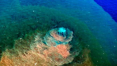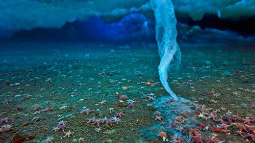 Por primera vez se grabó en las gélidas aguas del  Océano Antártico, a temperaturas inferiores a los 20 grados bajo cero, sobre una gruesa capa de hielo  y se forma a la diferencia de temperatura entre la parte superficial del océano y el fondo, que se encuentra a menos de 2 grados. El flujo de agua salina forma una estalactita de hielo, su poder letal va tejiendo una tela de araña que cógela todo lo que toca.