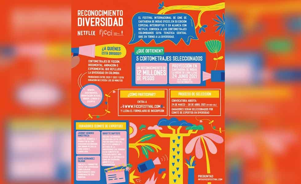 Más noticias positivas trae esta versión del Festival Internacional de Cine de Cartagena de Indias es que de la mano del canal de internet Netflix, los cortometrajes colombianos de ficción, documental, animación o experimentales, que en su contenido toque el tema de la diversidad en su forma, origen, religión, orientación sexual, lengua, cuerpo o cualquier otra forma de diversidad, podrán postularse para la Primera Muestra Diversidad Netflix-FICCI.