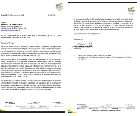 La misiva precisa que la decisión se toma también en base a que Barranquilla ya tiene una tradición deportiva, donde ya se han organizado con éxito dos juegos centroamericanos y del Caribe, unos Bolivarianos, y varios Nacionales. Así mismo, los últimos Centroamericanos fueron organizados en 2018 y “recibieron los mayores elogios de los participantes y de las autoridades de la Organización Deportiva Centroamericana y del Caribe, ODECABE”, señala el documento.