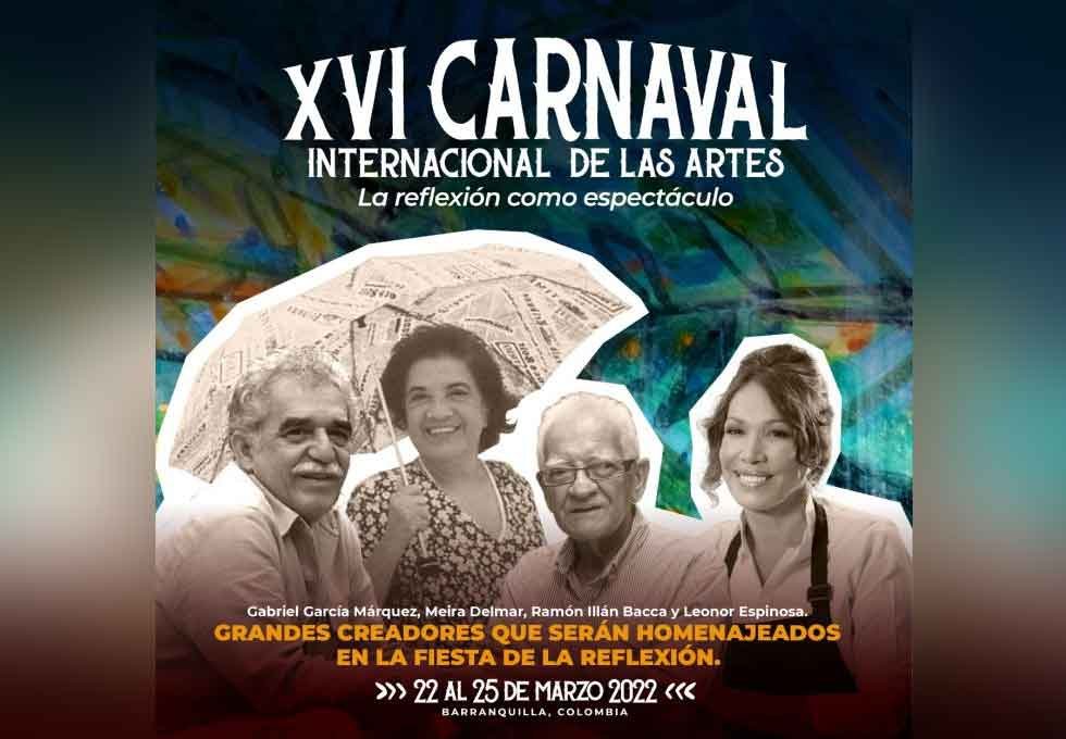 Dos escritores, una poeta y una artista que crea desde la cocina, serán homenajeados en el XVI Carnaval Internacional de las Artes, que se realiza en Barranquilla del sábado 19 al viernes 25 de marzo con la participación de más de cuarenta invitados de diferentes territorios del mundo.