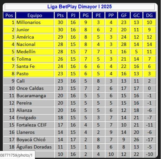 El conjunto albiazul llegó a 30 puntos, los mimos que Junior, que el sábado cayó 1-0 en su visita al Deportivo Pereira. Millos es puntero por tener mayor diferencia de goles que los tiburones (+10 por +9).Los dos goles de Millonarios fueron convertidos por Daniel Ruiz, el primero de ellos mediante el cobro de una pena máxima,