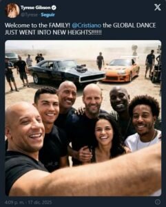 La presencia de Cristiano Ronaldo en el set de rodaje fue confirmada de manera visual a través de una imagen compartida por Tyrese Gibson en su perfil de la red social X. En la fotografía se puede ver al futbolista posando junto a varias de las principales estrellas de la franquicia. De izquierda a derecha aparecen Vin Diesel, Cristiano Ronaldo, Dwayne “The Rock” Johnson, Jason Statham, Michelle Rodriguez, el propio Gibson y el rapero Ludacris. La imagen no solo confirmó los rumores, sino que dejó claro que la participación del jugador es real y forma parte activa del proyecto.