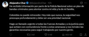 En su mensaje, el mandatario distrital advirtió sobre la gravedad de las amenazas y subrayó la necesidad de priorizar la seguridad a nivel nacional. “Colombia no puede retroceder. Hoy más que nunca, la seguridad nos preocupa profundamente y debe ser una prioridad nacional”, señaló Char, quien además hizo un llamado urgente a las Fuerzas Armadas y a las autoridades judiciales para que actúen con contundencia frente a este tipo de situaciones.