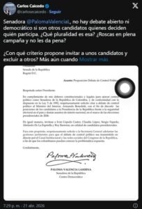 La controversia surgió a raíz de la solicitud presentada por Valencia ante el presidente del Senado, Lidio García Turbay, para citar al ministro del Interior, Armando Benedetti, con el propósito de discutir las garantías electorales de cara a los comicios programados para el 31 de mayo. En dicha propuesta, la senadora incluyó a algunos candidatos presidenciales, pero dejó por fuera a otros, lo que generó fuertes críticas desde distintos sectores.