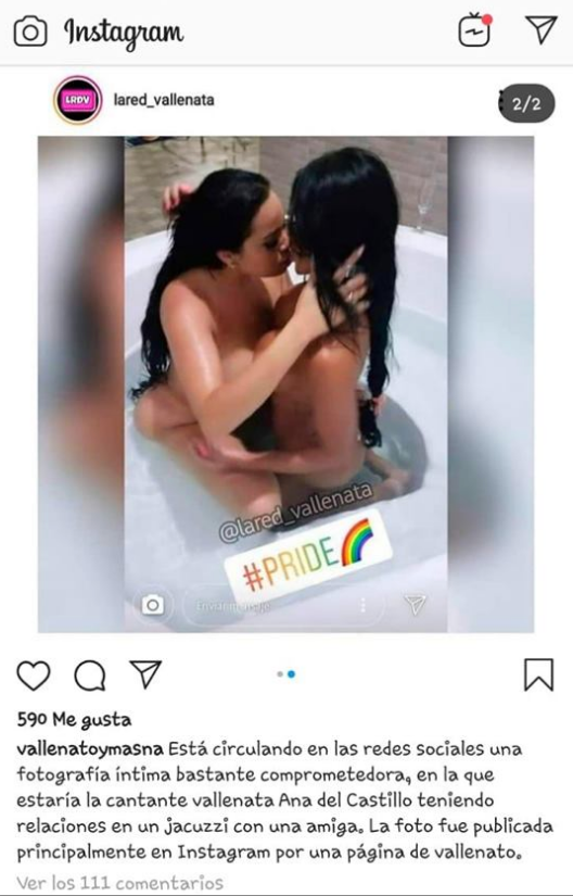 Una cuenta de Instagram que suele publicar noticias de artistas vallenatos, reveló en las últimas horas una comprometedora fotografía en la que supuestamente aparece la cantante Ana del Castillo besándose con otra mujer dentro de un jacuzzi.