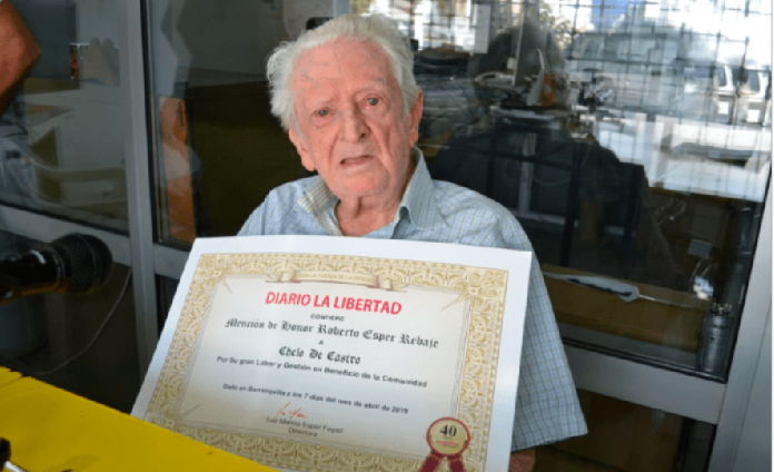 “Agradezco al Diario LA LIBERTAD y a la doctora Luz Marina Esper por tan magno reconocimiento”, dijo De Castro, quien hace un mes llegó a sus 99 años de vida.