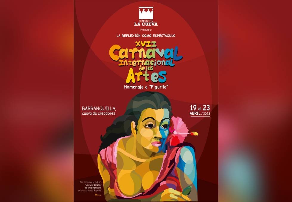 El afiche del Carnaval Internacional de las Artes 2023, es una recreación de la pintura original ‘La mujer de la flor del arrebatamacho’, de Orlando ‘Figurita’ Rivera, un cuadro inspirado en Rosita Mosquera, musa del artista, que fuera la obra ganadora del último Salón de Pintores Costeños que organizara La Cueva en la década del 50.
