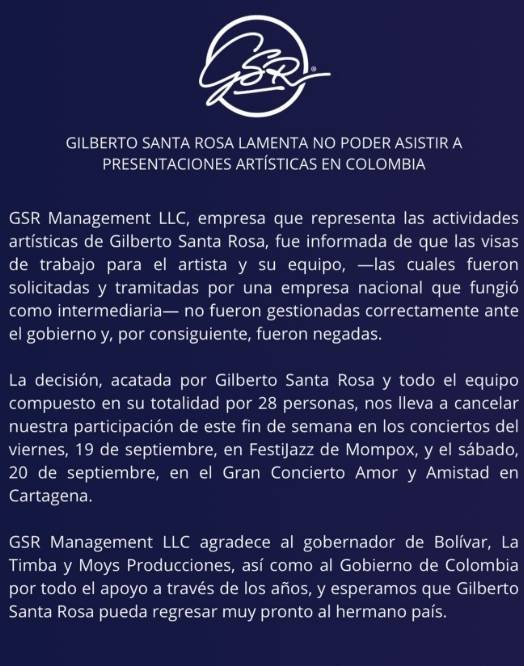 El reconocido cantante puertorriqueño Gilberto Santa Rosa, una de las figuras más emblemáticas de la salsa a nivel internacional, no pudo presentarse en el FestiJazz de Mompox, programado para el viernes, ni en la presentación que tenía agendada en Cartagena el sábado. La razón fue la negación de la visa de trabajo, requisito indispensable para que él y su equipo pudieran ingresar y presentarse legalmente en Colombia.